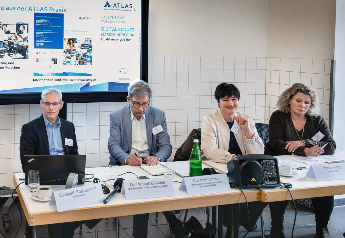 Dr. Hendrik Biebeler (BIBB) vermittelte grundlegende Informationen zum Konzept der Teilqualifikationen (TQ) und zu den Stärken des Instruments. Auf Basis qualitativer und quantitativer Erhebungen stellte er zentrale Gelingensbedingungen für ihre Umsetzung vor. Reinhard Völzke (MAGS NRW) erläuterte die in NRW geltenden Grundsätze zu Teilqualifikationen, auf die sich die Arbeitsmarktpartner im Rahmen der Fachkräfteoffensive Nordrhein-Westfalen verständigt haben. Einblicke in die Umsetzungspraxis in Südwestfalen gaben Kirsten Kling (agentur mark GmbH) und Daniela Knetsch (Gemeinsamer Arbeitgeberservice der Agentur für Arbeit Iserlohn und des Jobcenters Märkischer Kreis). Vorgestellt wurde die Implementierung der Teilqualifizierung zum Maschinen- und Anlagenführer im Rahmen des Projekts „ATLAS – Automotive Transformationsplattform Südwestfalen“ realisiert.